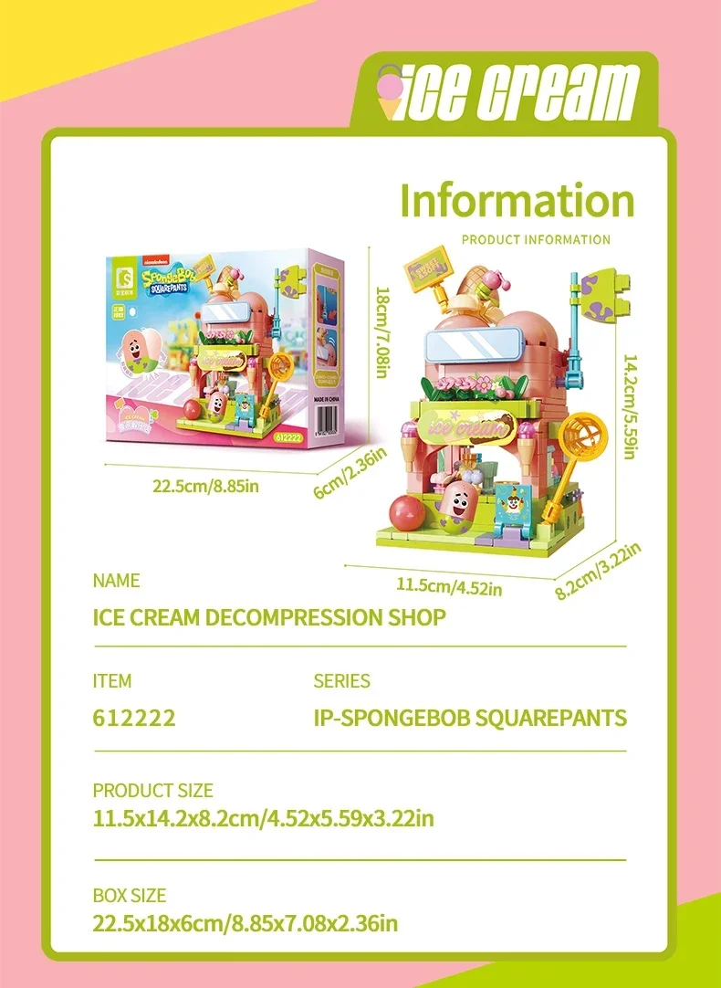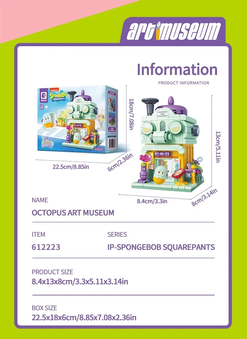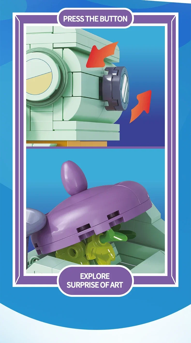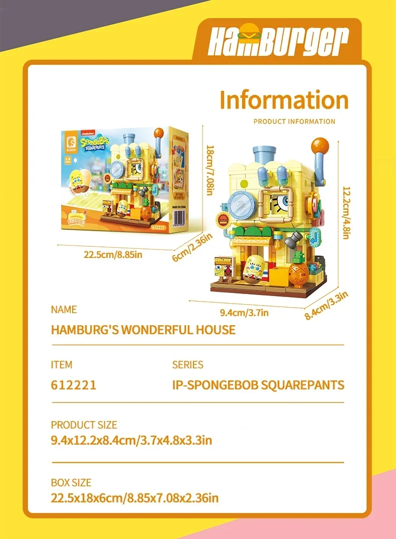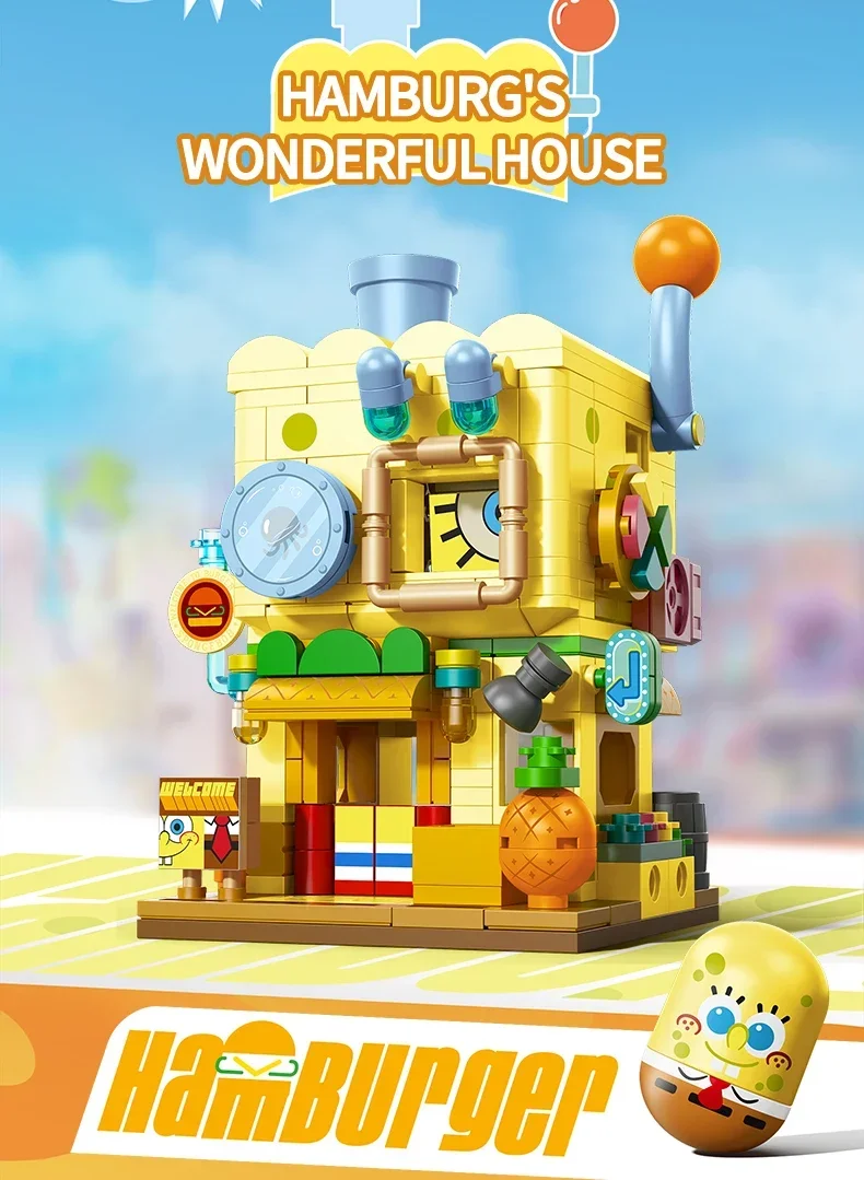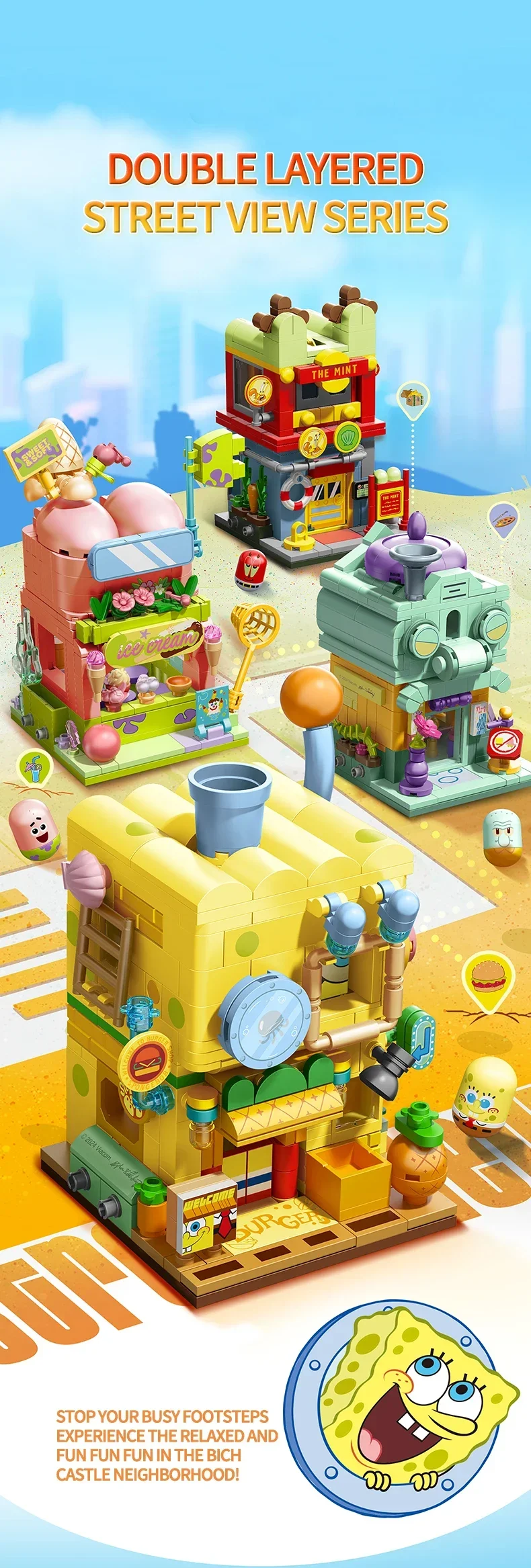 Bring Bikini Bottom to life with this detailed SpongeBob SquarePants double-layer building blocks set! Featuring the iconic Hamburger House, Ice Cream Shop, and Art Gallery, this set offers endless fun and creativity for kids and SpongeBob fans alike.