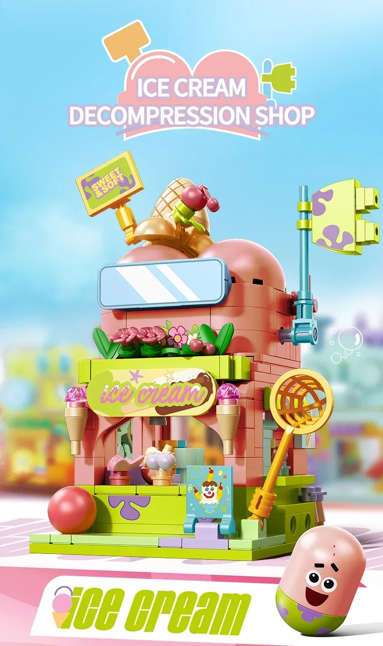 🧱 SpongeBob SquarePants Building Blocks Double Layer Street Scene – Hamburger House, Ice Cream Shop & Art Gallery Bricks Set Kid Toys 🍔🍦🎨