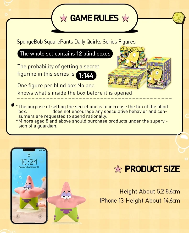 Unbox the unexpected with the Daily Quirks Blind Box Series – featuring adorable SpongeBob SquarePants characters in fun, quirky styles! A perfect surprise for fans, collectors, and lovers of all things cute and animated.